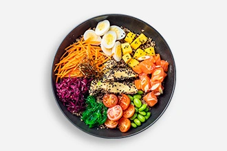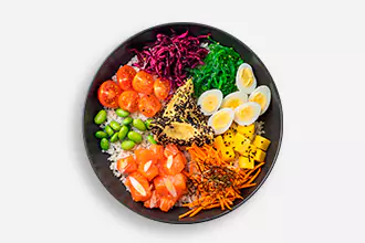 Salmon, Nori, Sesame, Avocado, Mango, Green onions, Wakame seaweed, Edamame beans, Carrots, Cherry tomatoes, Quinoa, Pickled cabbage, Poke sauce, Black sesame, Quail eggs
