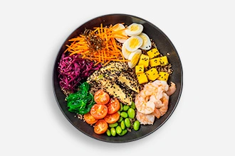 Nori, Sesame, Avocado, Shrimp, Mango, Wakame seaweed, Edamame beans, Black sesame, Carrots, Cherry tomatoes, Quinoa, Pickled cabbage, Poke sauce, Quail eggs