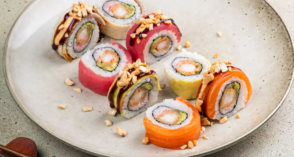 В основі лосось, тунець і вугор. До них додаються авокадо, креветка темпура та кеш’ю. Соус унагі об’єднує всі інгредієнти та додає солодкуватий акцент.