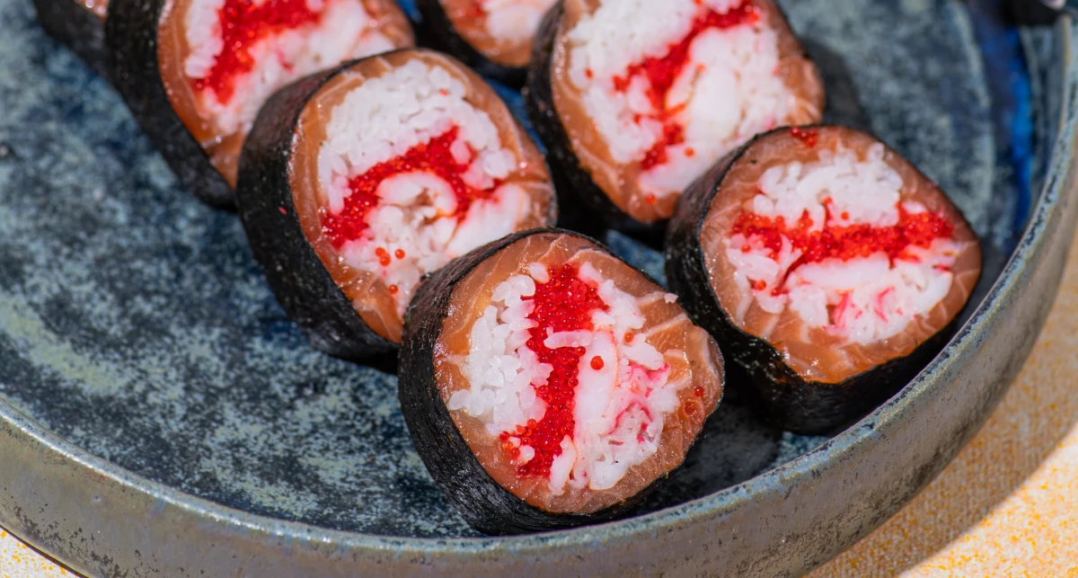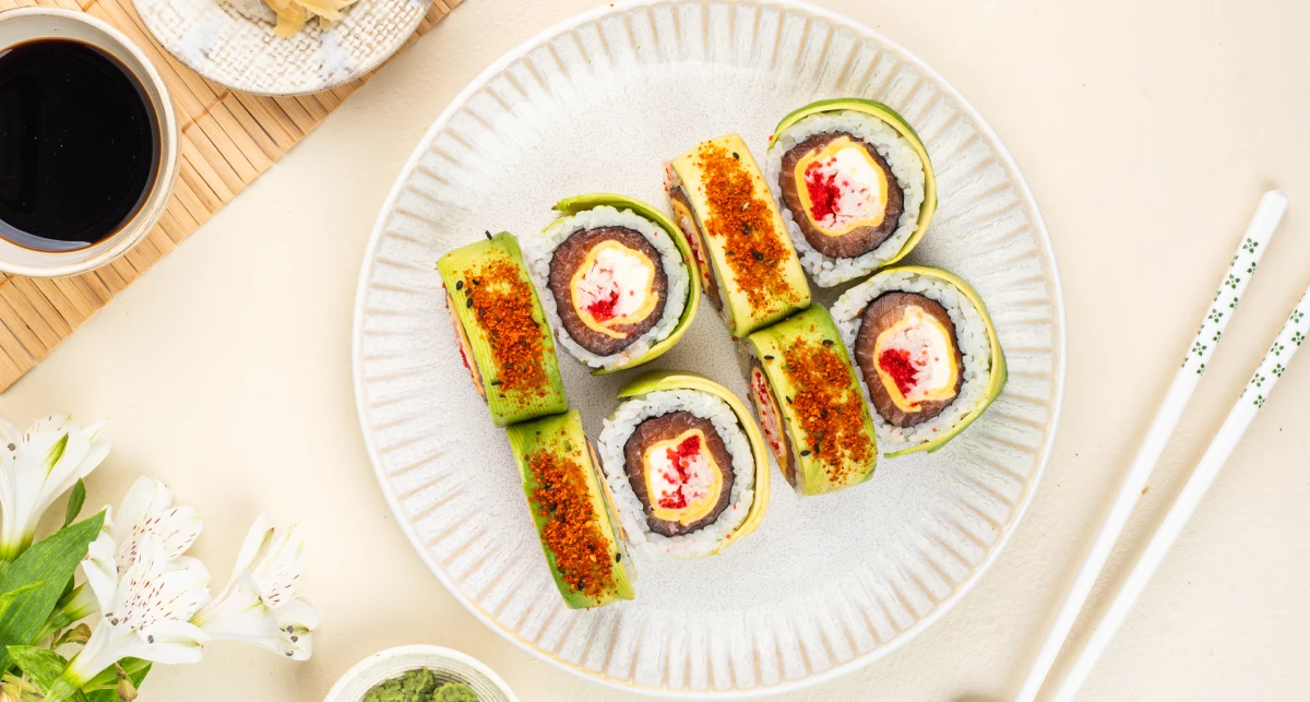 Вершковий сир, авокадо та крабовий заміс формують основу, до якої додаються маринований лосось, ікра та чеддер. Рол виходить виразним, із насиченими, але збалансованими акцентами.