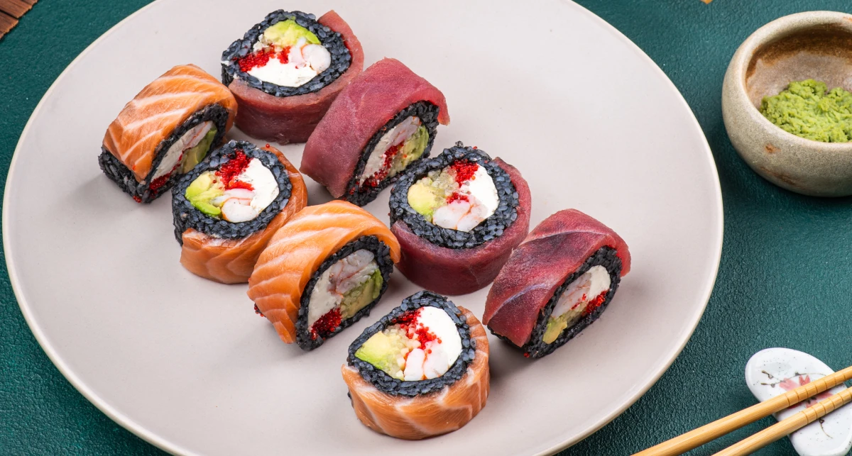 Тут уся магія криється в балансі смаків. Вершковий сир, огірок та авокадо додають м’якості. Тунець, креветка та ікра додають насиченості. Чорнило каракатиці відповідає за зовнішній вигляд і робить рол контрастним і впізнаваним.